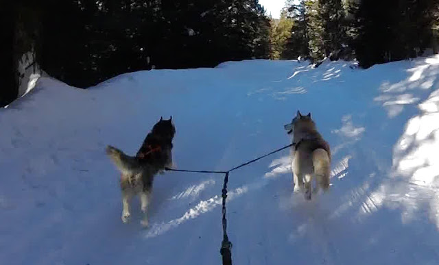 Beautiful day, beautiful conditions, a tad chilly for the human but PERFECT for the Siberians: 9 miles traveled with 700 feet of elevation climbed and a top speed of 22 MPH.